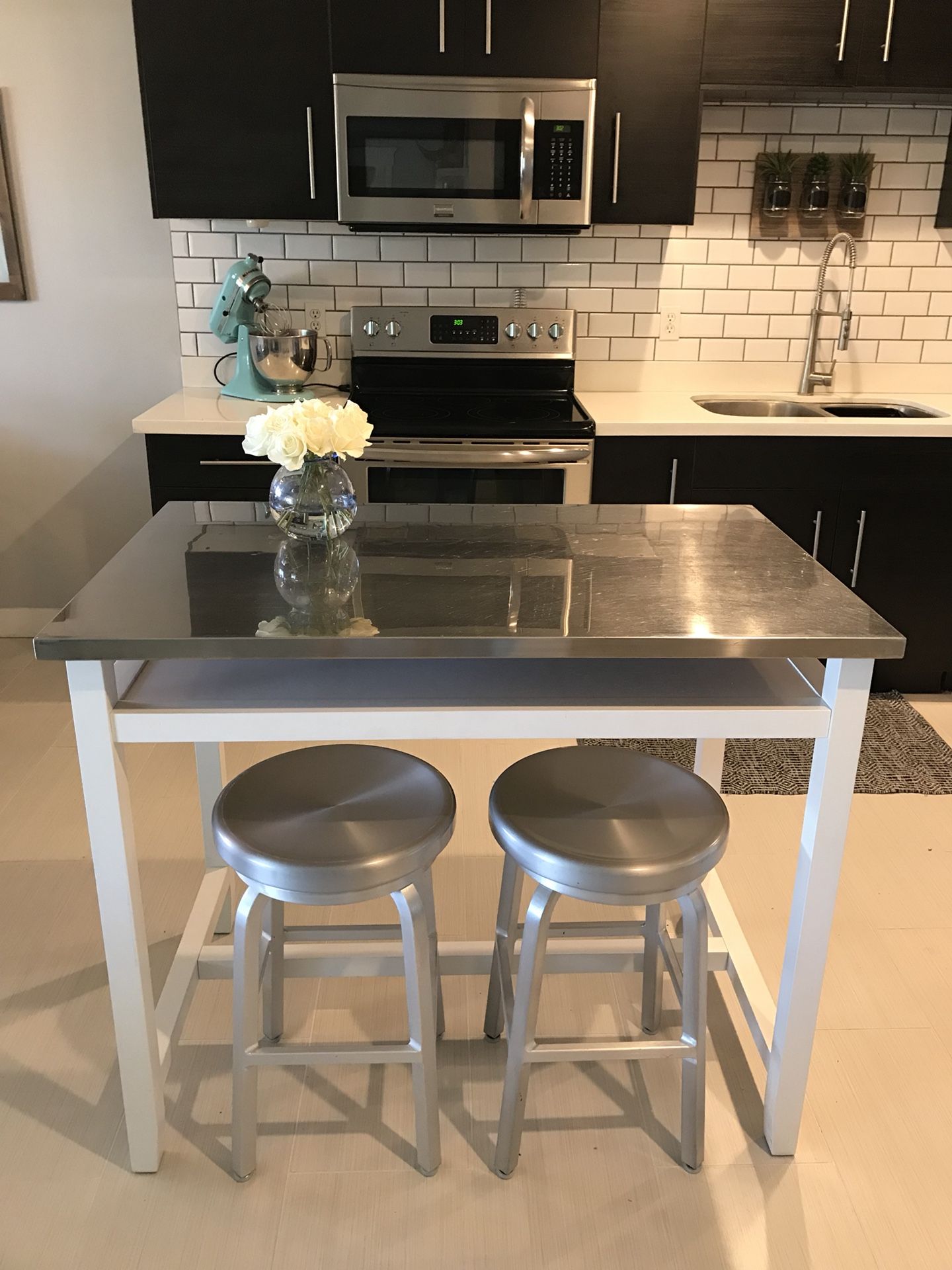 Stainless Steel Kitchen Islands Ideas And Inspirations from cdn.decoist.com When positioning them around a kitchen island, consider making space for a seat or two on either end for a setup more similar to a dining table. Take this stool, for example: 5 out of 5 stars. Pull up a swivel barstool for drinks, appetizers, desserts and more. A row of white barstools complements the white backsplash and countertops while chrome pendant lights over the large island add an industrial flair to this sleek space. Our lemans barstool and counter stool are designed to capture the soul of french country furniture. Shop for kitchen island with stools online at target. Metal and chrome step stool, pale yellow black silver, mid century kitchen ladder, industrial farmhouse decor, 50s 60s, stylair.